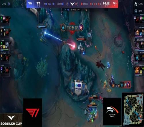 中期下路团战,Peanut赵信击退Doran掘墓,Keria妮蔻大中HLE四人,Gumayusi女枪开扫,Zeka塞拉斯进场不断控制,Viper卡莉丝塔反手连斩三人,HLE打出1换4并接连拿下两条小龙。后续Zeus贾克斯与Zeka塞拉斯在先锋团先后单杀T1下路双人组,HLE经济依旧落后1k。